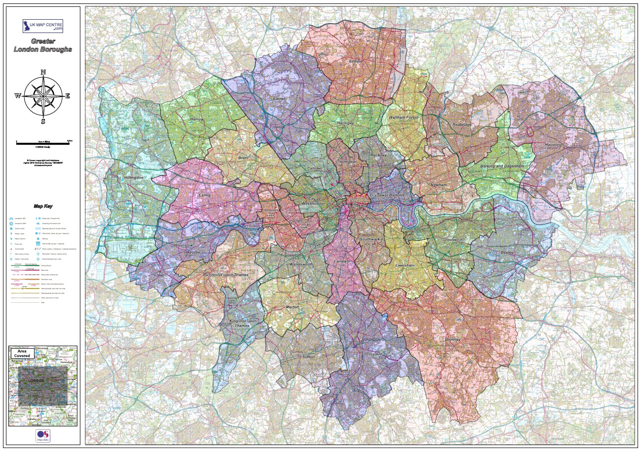 The Greater London Authority Borough Map is a 1:55000 scale map of London with the boroughs highlighted making this ideal for city, district and borough planning. Created using up-to-date OS 1:50,000 scale mapping (scaled to 1:55,000) this map gives great detail for the city.