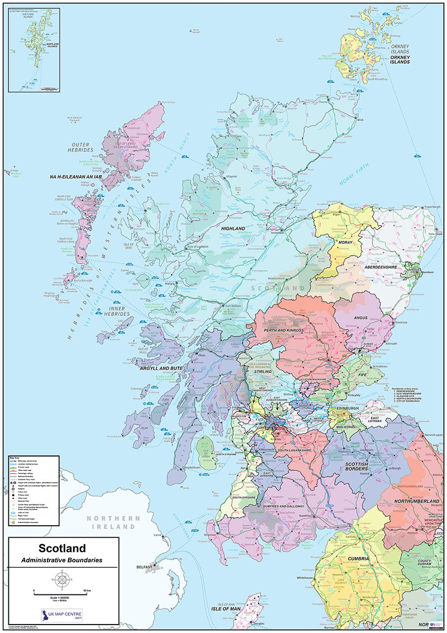 - 1:500,000 scale map of the Scotland County Boundaries highlighted in different colours for ease of use