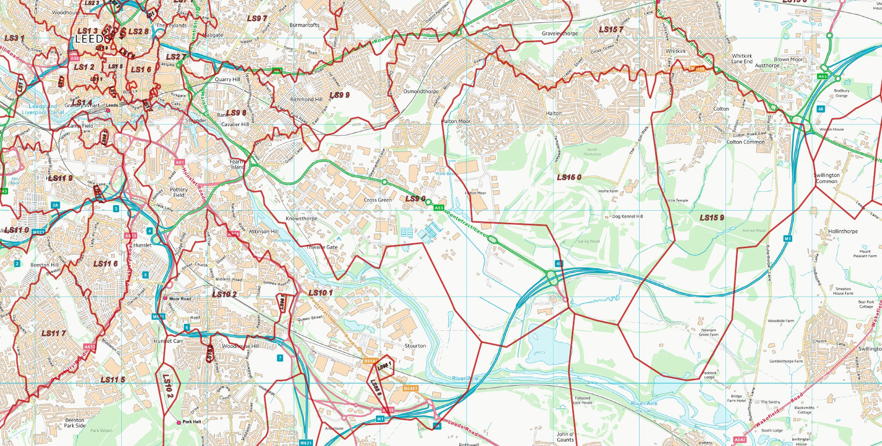 The Postcode City Sector Map of Leeds displays the sector postcodes in and around Leeds. The 1:25000 scale district mapping provides great detail for control rooms and offices. The Postcode City Sector Map file for Leeds measures 1200mm x 841mm (A0 Landscape) and is supplied as a high quality PDF which can be downloaded on the order confirmation page.